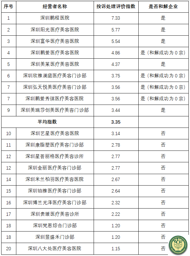 深圳市消委会发布医疗美容行业 经营者投诉处理评价指数排行榜