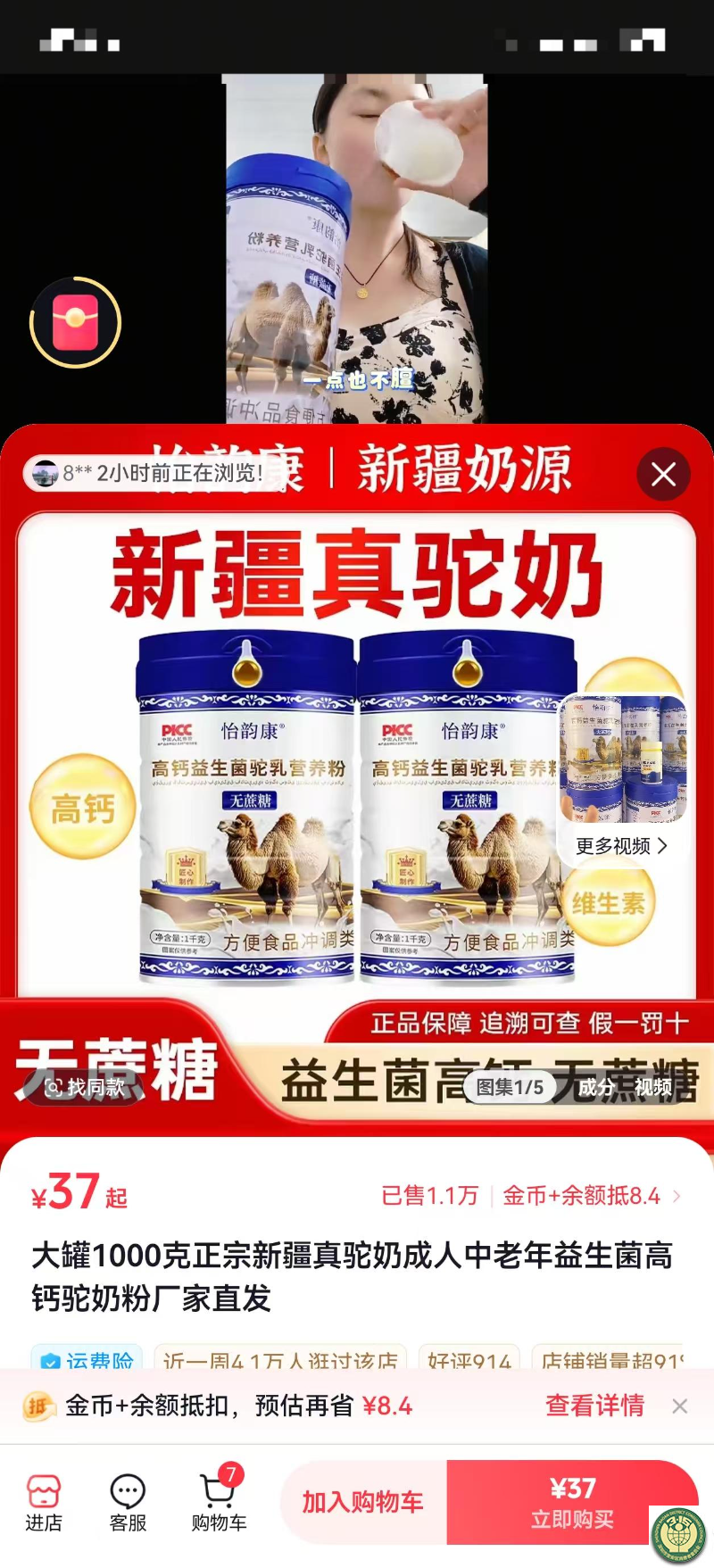 在怡韵康驼乳食品店的广告视频中,主推一款大罐装1000克的“新疆正宗驼奶粉”,主播称“你们可别买那种价格高又没品质的驼奶粉了,我一直喝的是怡韵康驼奶粉,配料表特别干净,甄选新疆双驼峰奶源,奶香味十足”。记者点开该视频下方的购物链接,发现其产品罐体上标注的产品类别是“方便食品冲调类”,商品介绍页面配料表前5位显示为“燕麦粉、全脂驼乳粉、山药粉、益生元、乳清蛋白粉”。